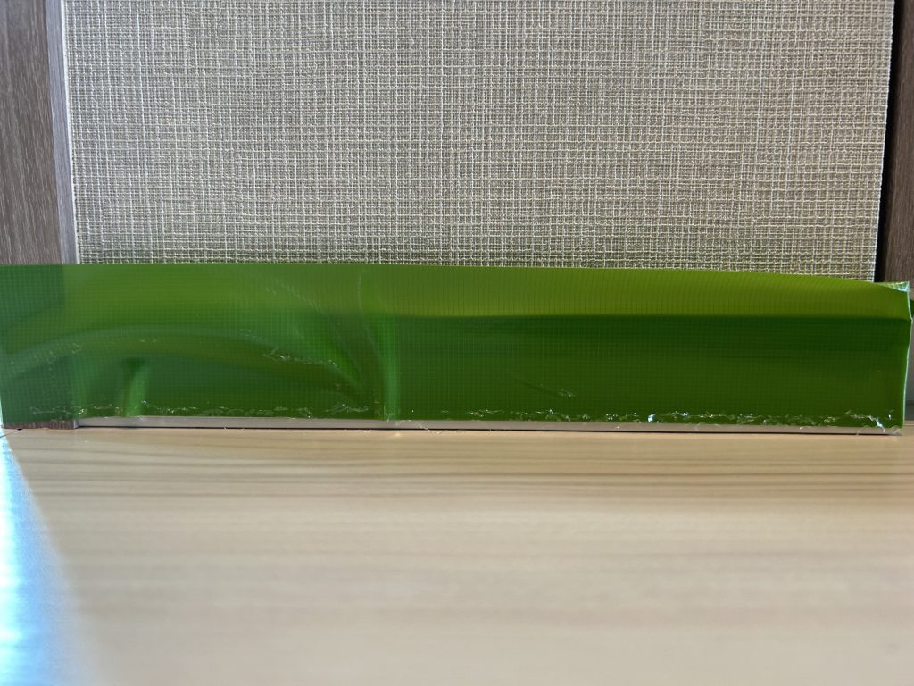 ガラスコーティングも十分に乾いており、養生テープにはコーティングのあまりが見られました、触ってみたところパリパリとした感触で、これがフローリングの上に塗布されていれば傷と汚れには安心だなと思いました。
