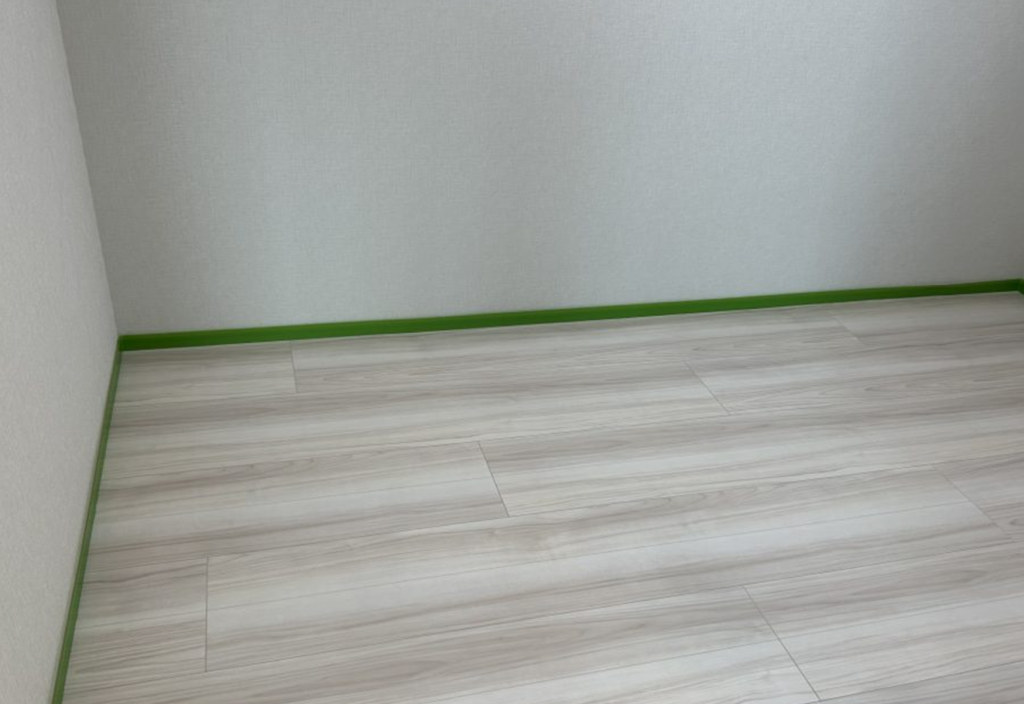 全ての床面をコーティングするため、すべての部屋の巾木に養生テープを張る必要があり、非常に大変でした…。